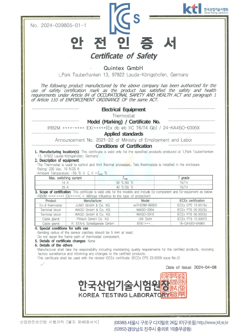 Our IRB2M...Ex (combination of capillary temperature controller and limiter for use in hazardous area) is now certified by KCs (Korean certificate)